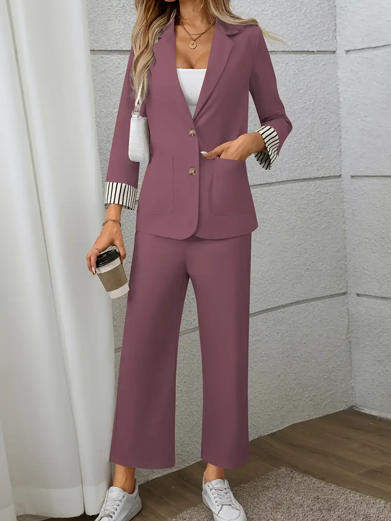 Featuring a blazer with striped cuffs and straight-leg trousers with a drawstring waist, this set is ideal for the office, casual evenings, or a weekend out.